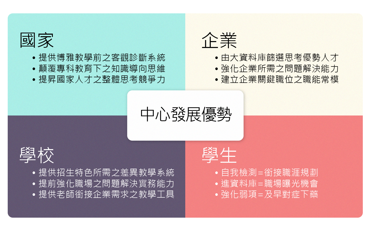 除將對學生提供首創的思考診斷及培育資源外(認證、競賽、教學、發展、職場銜接等),系統性強化學生畢業前的邏輯思考應用能力,並提供企業現有人才思考職能認證,期望進一步建立思考能力發展之常模標準,進一步建立優質單位之教學及訓練標竿。